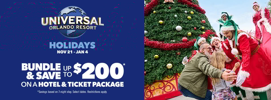 ^Bundle and Save offer discount only applies to Universal Orlando vacation packages purchased on Universal Parks & Resorts Vacations websites (UniversalOrlando.com, UniversalOrlandoVacations.com, VAXVacationAccess.com/UPRV), the Universal Orlando Guest Contact Center or through travel agencies registered to sell vacation packages with Universal Parks & Resorts Vacations. Valid for bookings 10/22/24 – 12/10/25 with travel 5/22/25 – 12/31/25. To qualify for savings, vacation package must minimally include a 2-night hotel stay and a 3-Park PLUS 1 Day Universal Epic Universe Ticket OR 3-Park Annual or Seasonal Pass (excludes Universal Epic Universe) for each member of the traveling party, except for The Wizarding World of Harry Potter™ Exclusive Vacation Package, which must minimally include a 2-Park Park-to-Park PLUS 1-Day Universal Epic Universe Ticket OR 2-Park Annual or Seasonal Pass (excludes Universal Epic Universe) OR 3-Park PLUS 1-Day Universal Epic Universe Ticket OR 3-Park Annual or Seasonal Pass (excludes Universal Epic Universe). Offer not valid on vacation packages with a 1-night hotel stay OR 1-Park, 2-Park, OR 3-Park Tickets (excludes Universal Epic Universe). Select packages require a minimum length of stay to book. Savings are based on length of stay. Offer valid on new bookings only and is not valid with any other offers, discounts, promotions or prior purchases. Void where prohibited. Additional restrictions may apply and are subject to change without notice. Bundle and Save does not apply to: vacation packages offered through online auction websites, membership programs, corporate discounts, group rates, promotional rates offered for groups including but not limited to associations, military, government, convention attendees, timeshare tour offers, or promotions not offered by Universal Parks & Resorts Vacations to the general public. Universal Parks & Resorts Vacations reserves the right to change or remove applicable savings as part of the Bundle and Save offer at any time without advance notice. Limited availability.